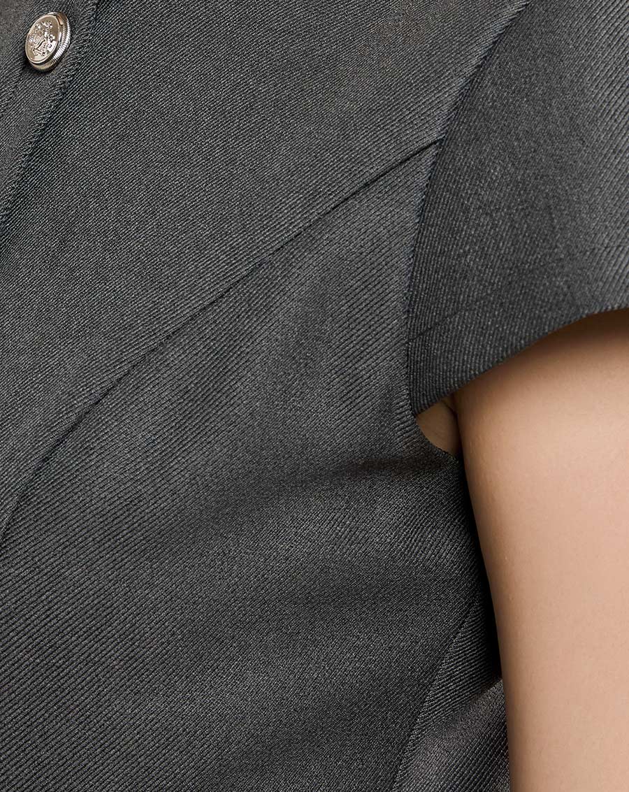 - Trang phục được thiết kế đơn giản, phần trên phối nút cách điệu, chân váy xếp ly tạo sự thoải mái tối đa cho người mặc