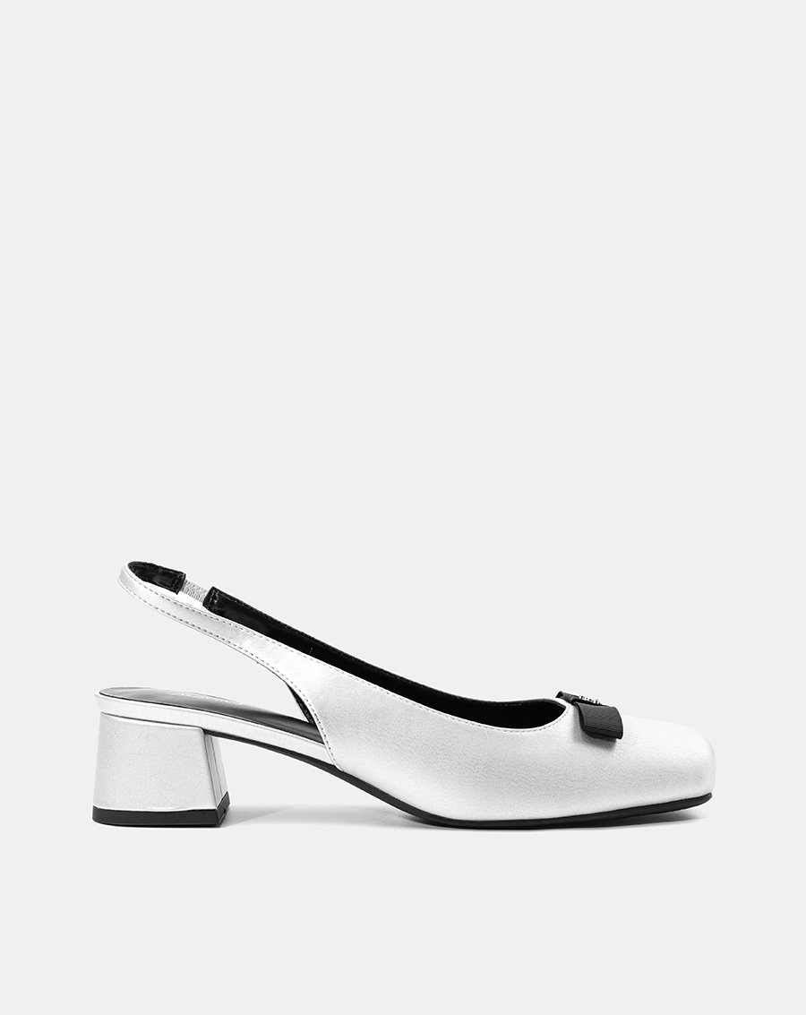 Giày thiết kế mũi vuông phối nơ, quai slingback tôn lên những bước chân uyển chuyển