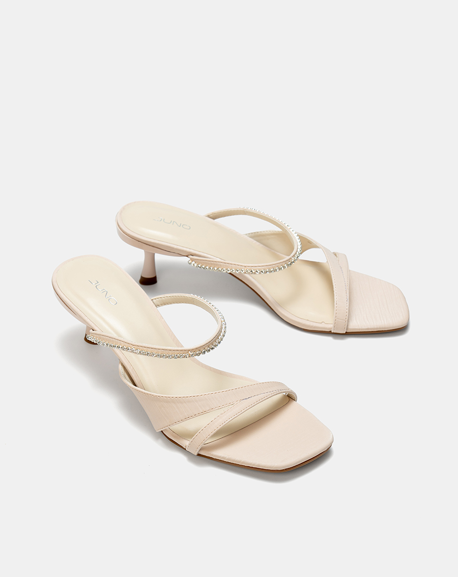 Giày mũi vuông, quai mảnh đan chéo đính đá mang lại nét nổi bật khi diện