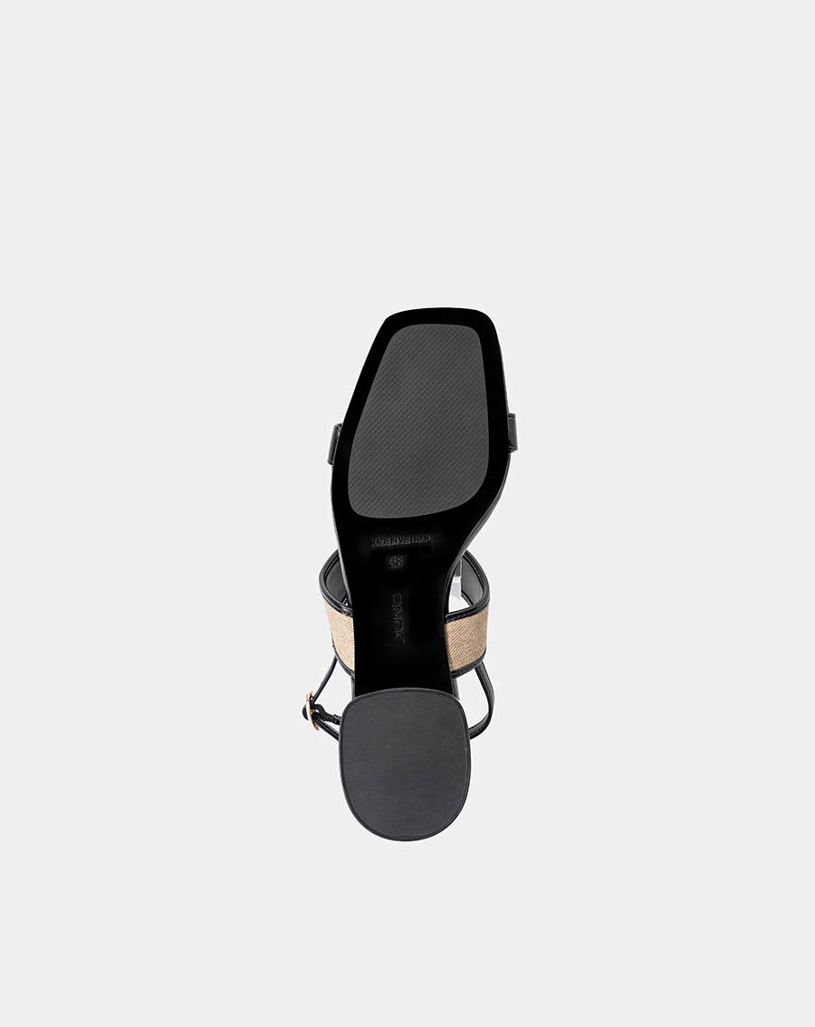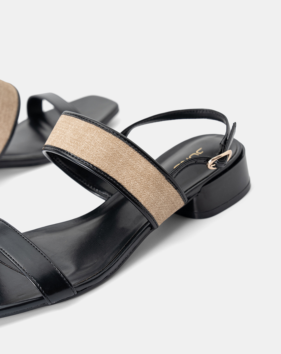 Thiết kế quai phối chất liệu dệt và da trơn, mang phong cách thanh lịch.