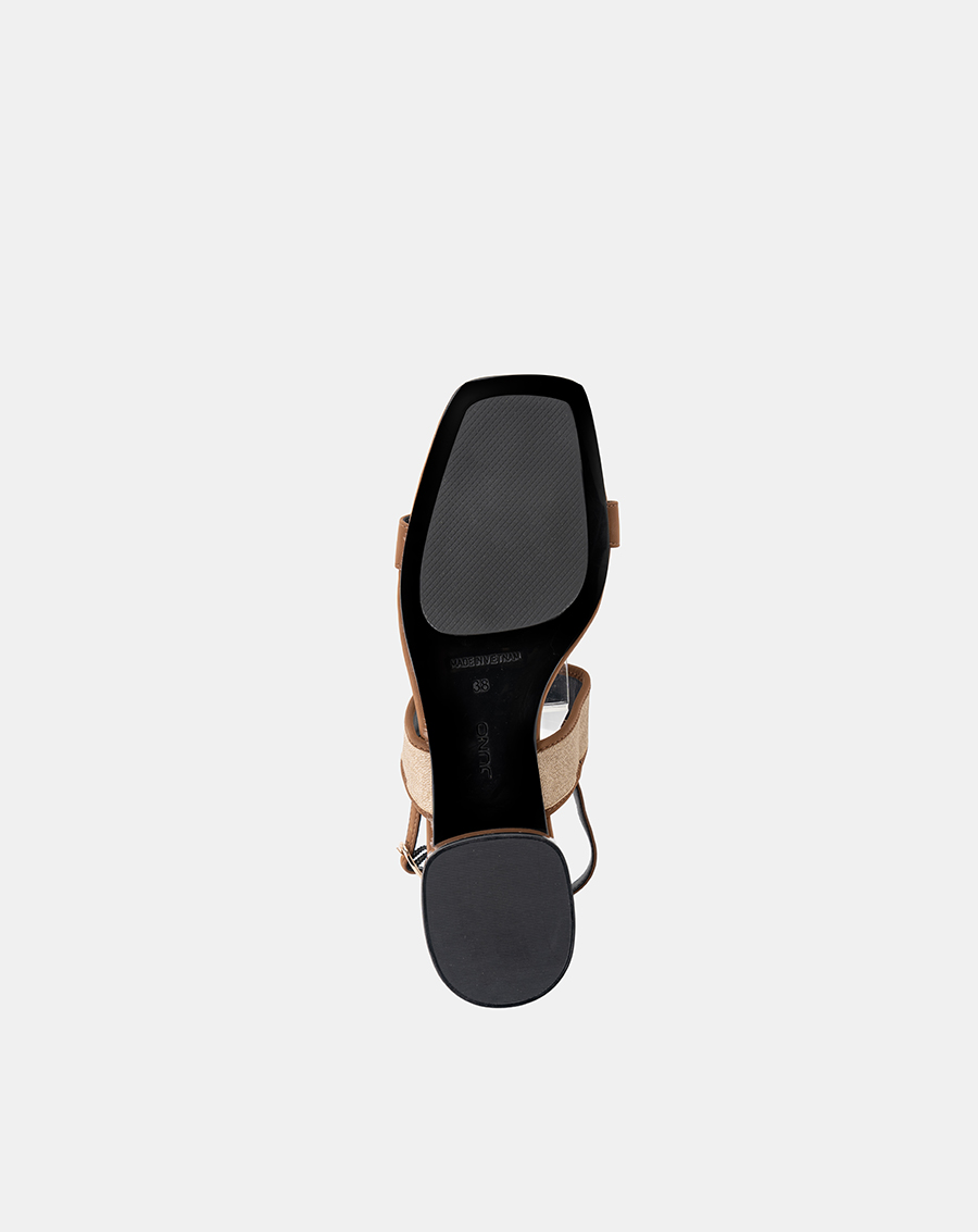 Thiết kế quai phối chất liệu dệt và da trơn, mang phong cách thanh lịch.