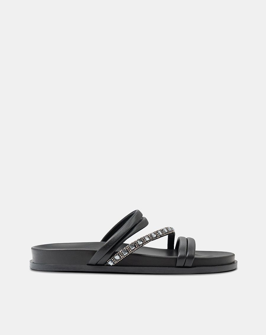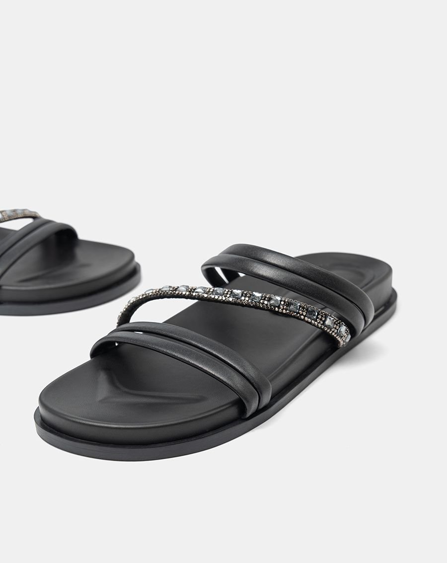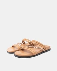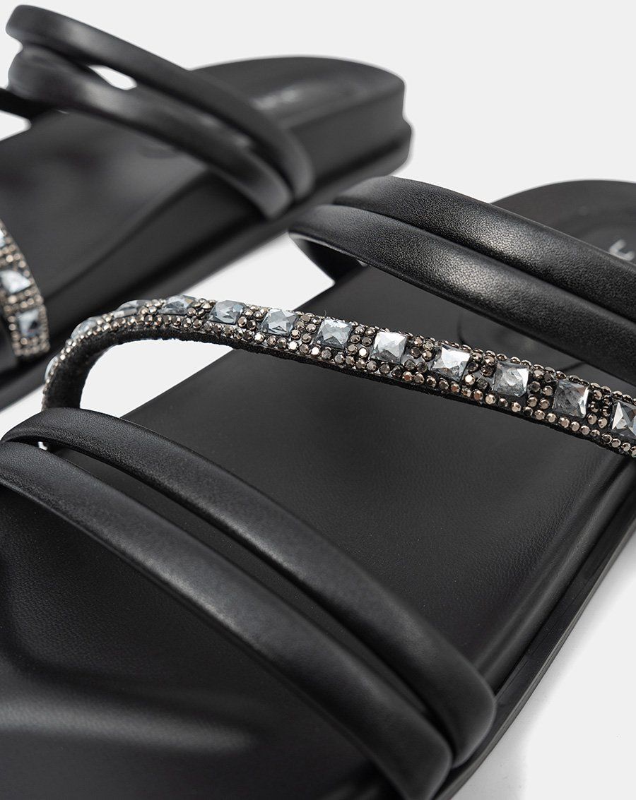 Giày mũi tròn, giày phối 2 quai ngang mảnh và 1 quai chéo đính đá nổi bật tạo nên sự uyển chuyển trong bước đi