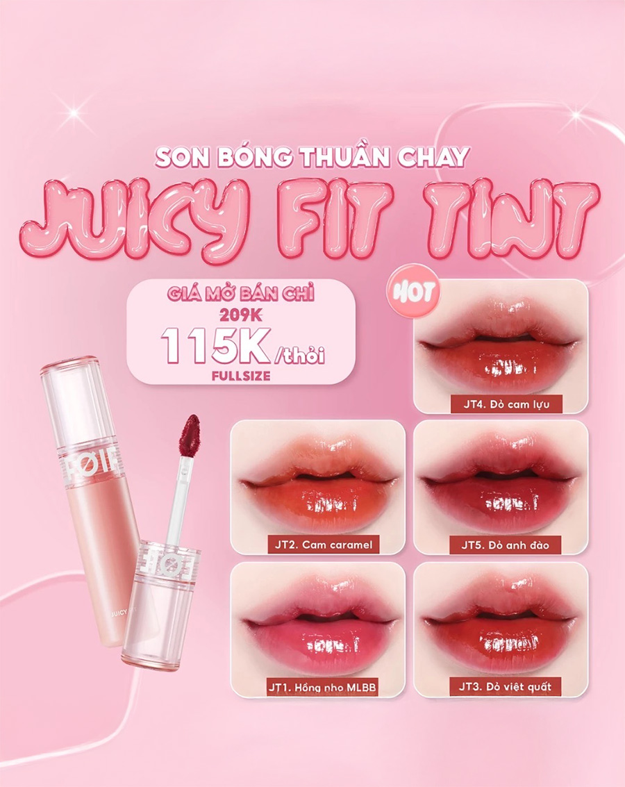 Son có kết cấu tint bóng mỏng nhẹ, dễ tán và tiệp môi nhanh chóng. Khi thoa, lớp son tạo hiệu ứng bóng trong veo như thạch, giúp môi trông đầy đặn và tươi tắn hơn. Dù chồng nhiều lớp, son vẫn giữ được cảm giác nhẹ môi, không bết dính, mang lại sự thoải mái suốt nhiều giờ liền.