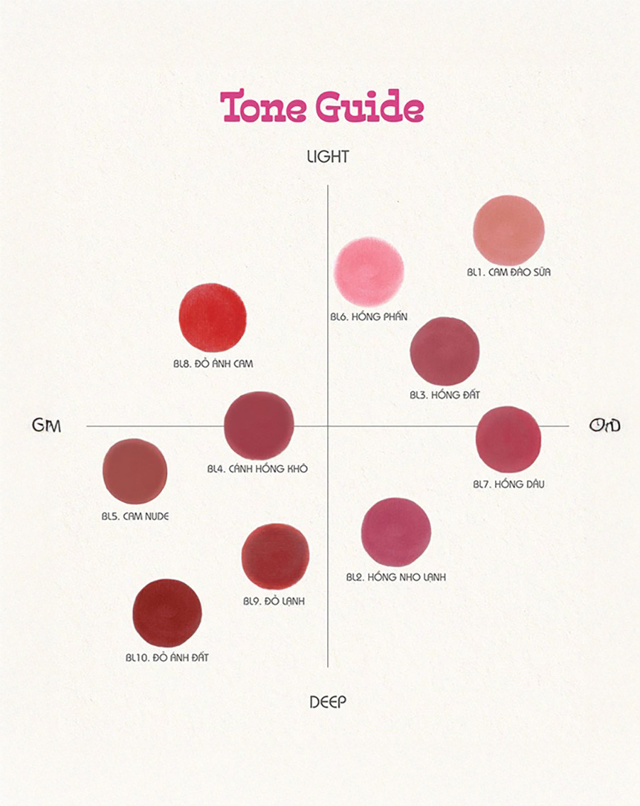Màu sắc: BL9 Ready Sunrise-BL4 Dusty Rose-BL10 Apple Wood-BL5 Musky Rosy-BL8 Fever Vibe