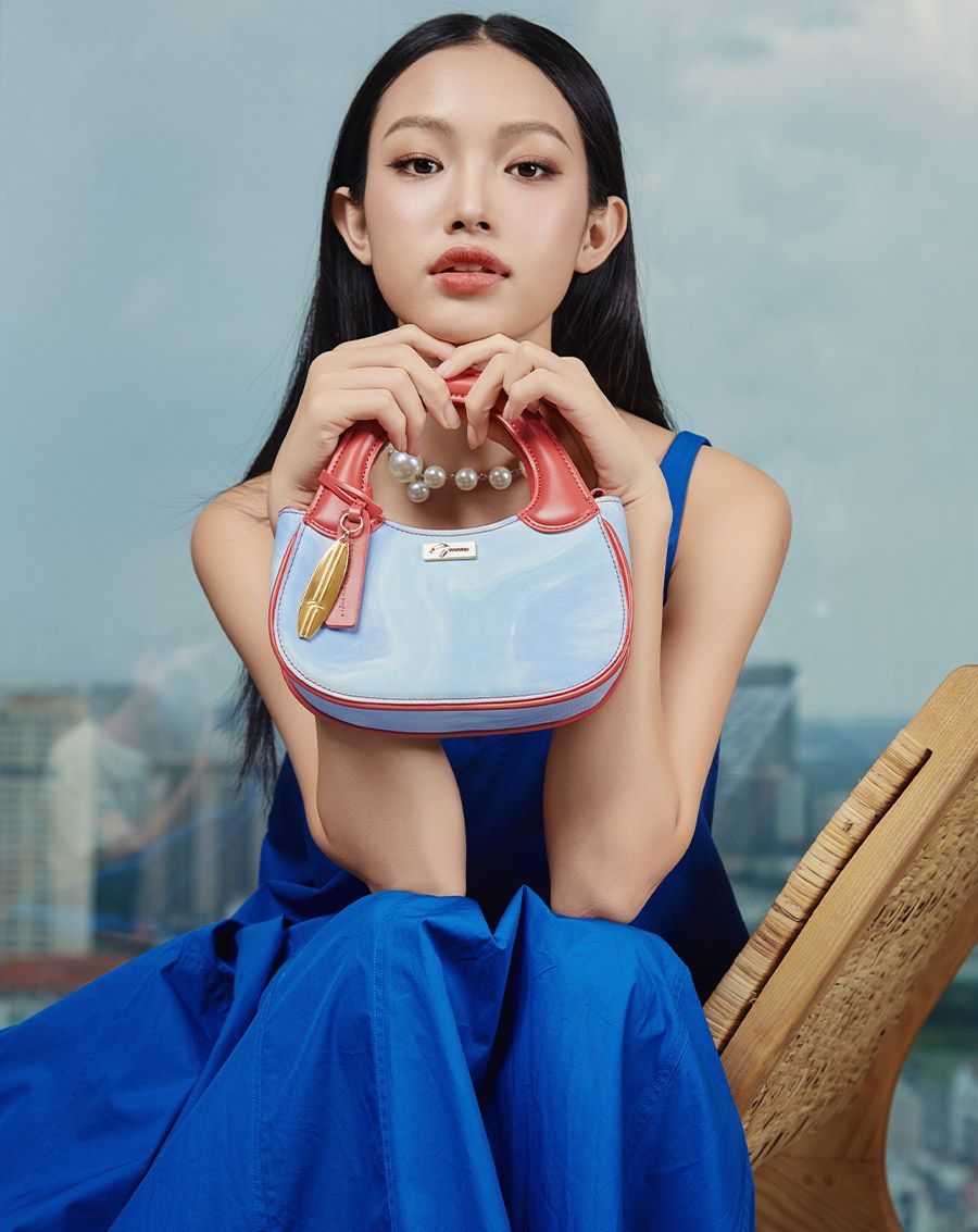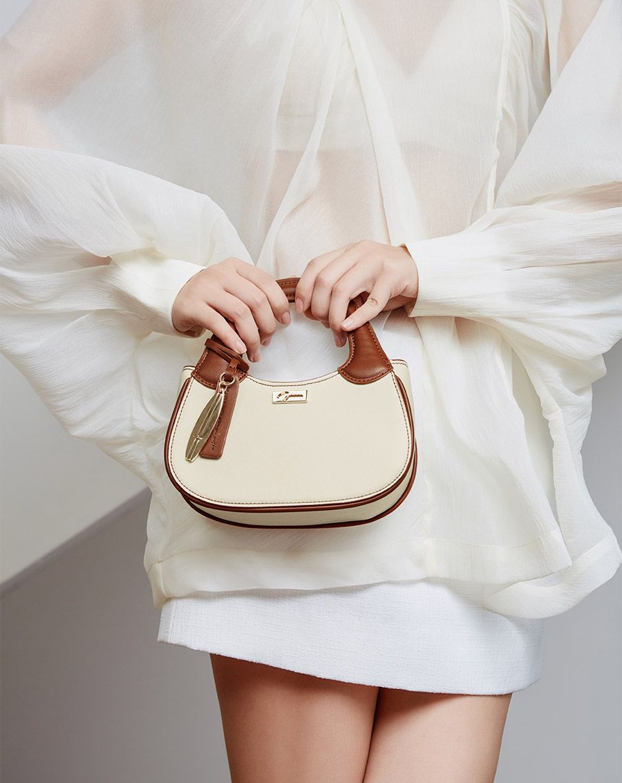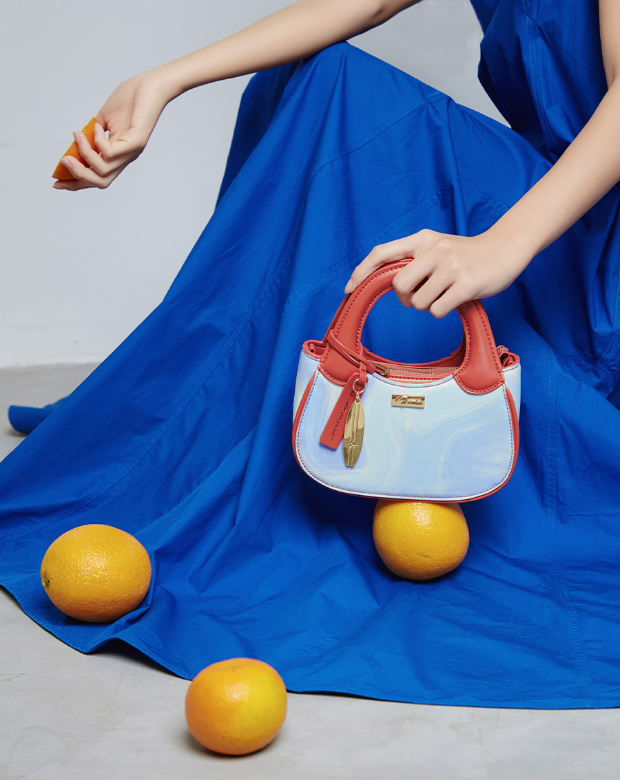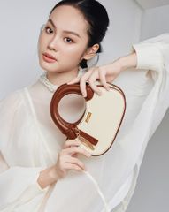 Kiểu dáng túi nhỏ bo viền góc mới lạ, phồi màu bề mặt túi cùng quai cầm tay cực kì nổi bật