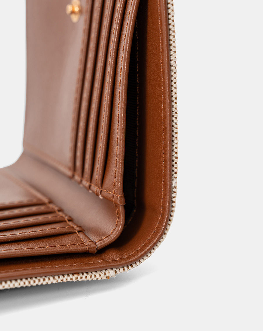 Thiết kế đơn giản, có ngăn khóa kéo và nhiều ngăn nhỏ bên hông đựng thẻ bên ngoài